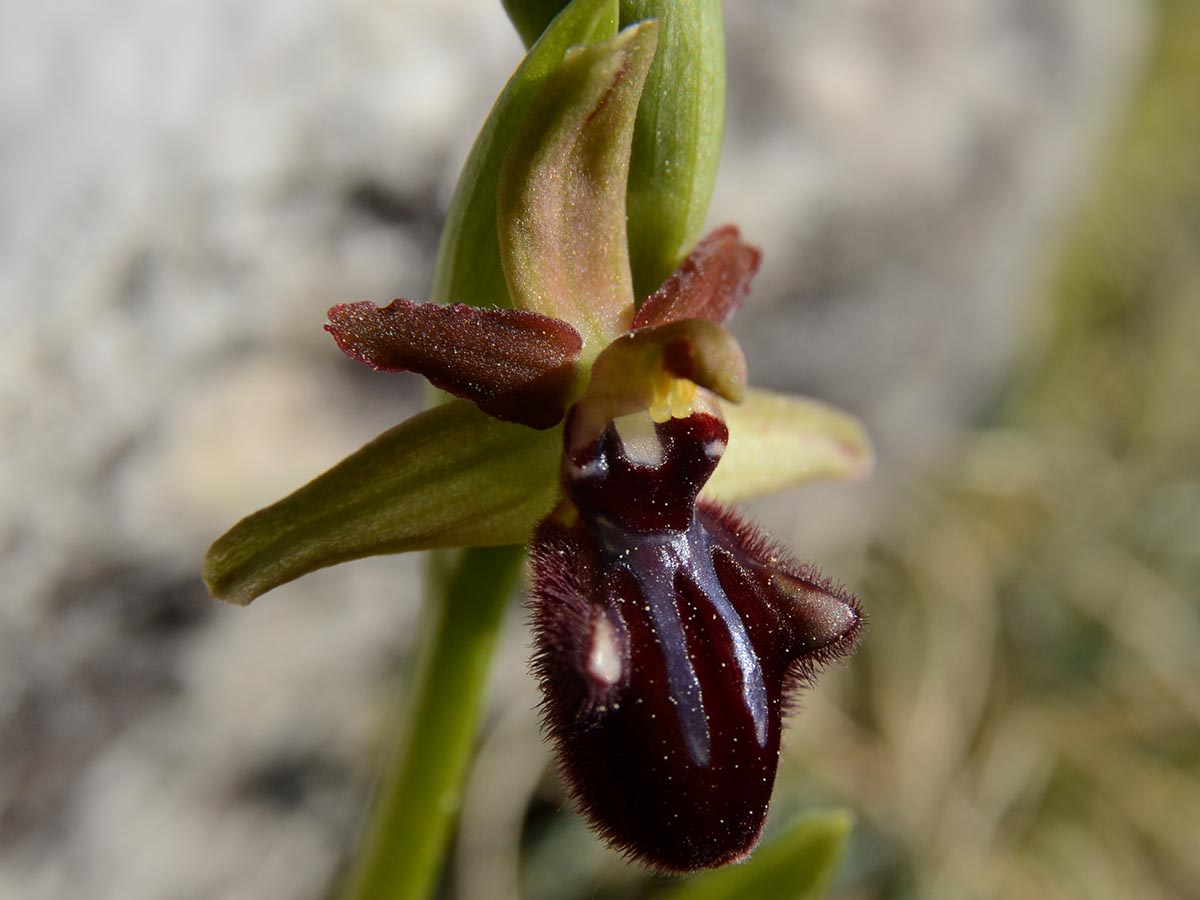 | Synonyme: Ophrys aranifera ssp. atrata, Ophrys aranifera ssp. incubacea, Ophrys atrata, Ophrys sphegodes ssp. atrata. Geophyt, planar-um. Die Säule ist vorne zugespitzt. Die meist etwas längliche Lippe hat an der Spitze kein Anhängsel. Die dunkelrotbraune bis violettbraune Lippe ist oben nicht behaart und trägt ein meist langgezogenes, mehr oder weniger glänzendes H-förmiges Mal. Die Lippenaußenseite ist lang zottig behaart. An der Lippenbasis erheben sich seitlich die innen kahlen Lippenhöcker. Die Sepalen sind meist grün, manchmal rötlich überlaufen. Die Petalen sind kahl, am Rand wellig. Die Pseudoaugen sind weiß. Die streng geschützte Art kommt an der gesamten istrischen Küste und den Kvarner Inseln zerstreut vor (Lit). Weltweite Verbreitung und Gefährdung siehe Royal Botanic Gardens KEW. |