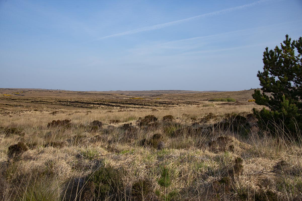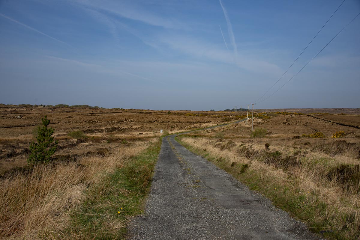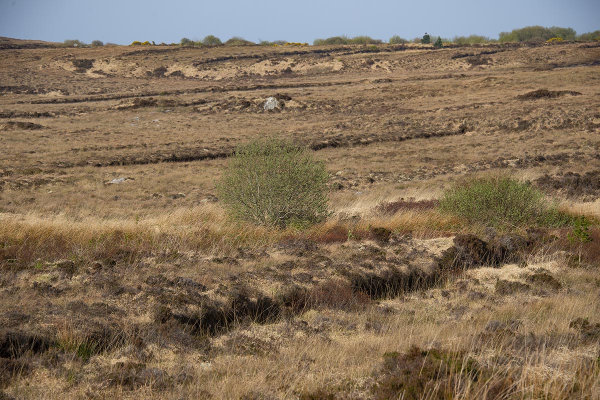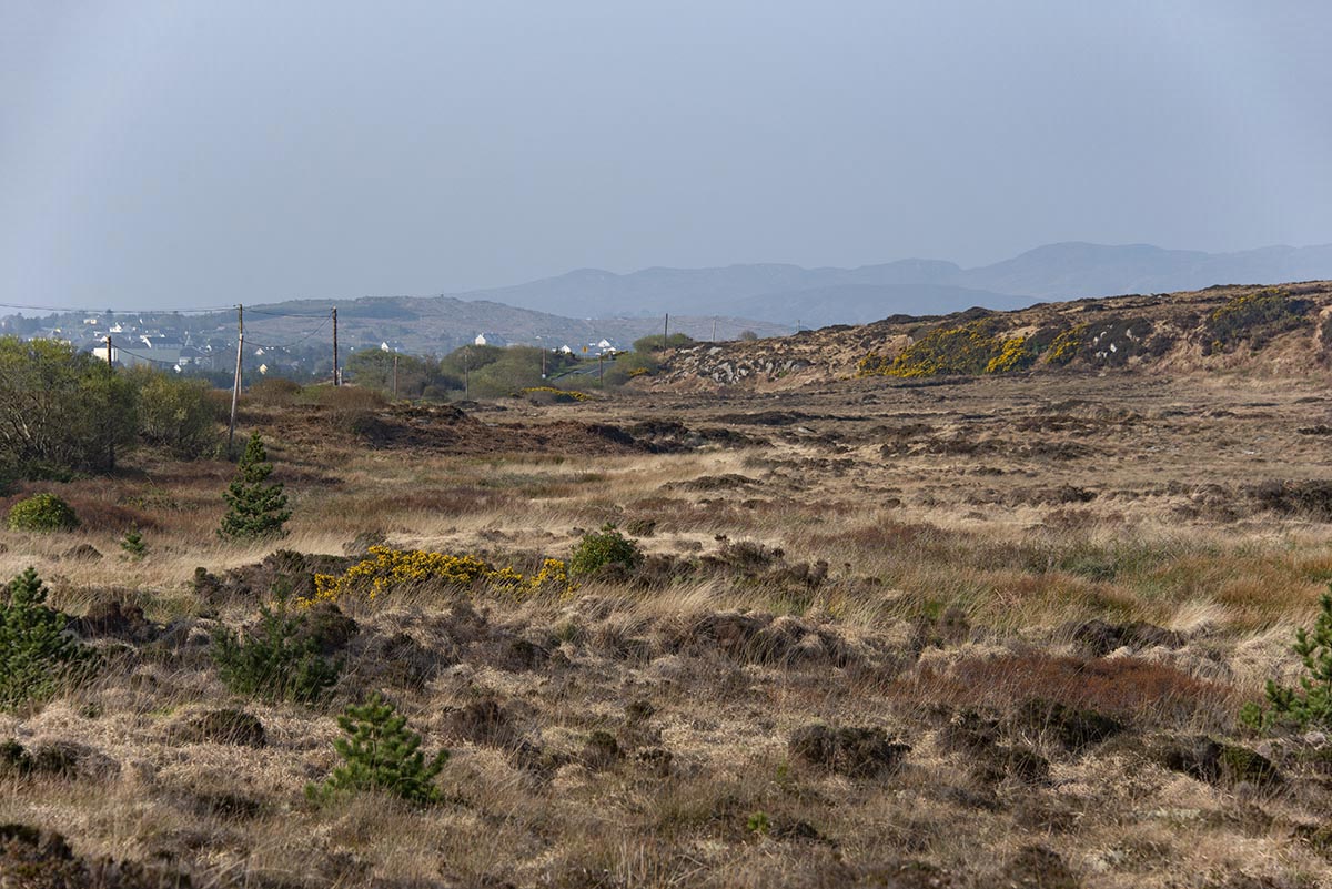 | Ein Deckenmoor (Blanket bog, Wikipedia) in der Gegend, die man "The Rosses" nennt: Relativ flach und ausgedehnt, durchzogen von diversem Gerinne und Furchen vom Torfabbau. Eine Fahrt durch dieses Gebiet im April vermittelt einen eintönigen Eindruck, lediglich der allgegenwärtige Stechginster bringt frische Farbe ins Bild. |