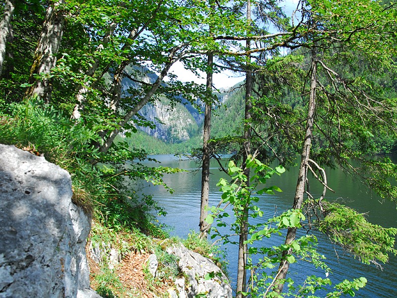 | Toplitzsee vom Boot aus mit Blick nach Osten. Hinter dem Wald liegt der Kammersee. Das Ufer des Toplitzsees besteht aus teilweise senkrecht abfallenden Felswänden, weshalb ein Fußmarsch zum Kammersee ausgeschlossen ist. |