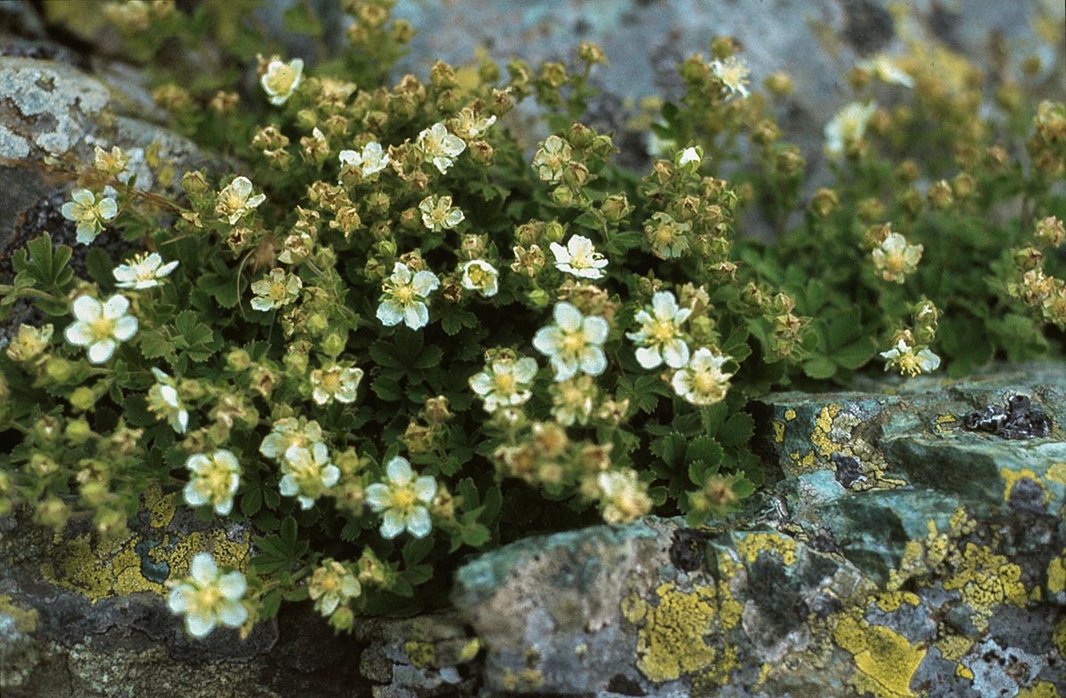 | Schon etwas weiter oben auf der Pta. di Zorpi entdeckten wir das Felsen-Fingerkraut (Potentilla rupestris var. pygmaea) oder La Potentille des rochers. Nach etwa 1 km GR 20 zweigten wir rechts hinauf zur Pta di Zorpi ab. Zwischen der Punta di Zorpi und der Punta dell´ Oriente fanden wir einen Platz zum Zelten. Mittlerweile hatte sich das Wetter verschlechtert und es begann schließlich zu regnen. |