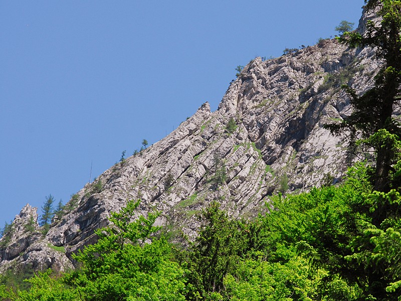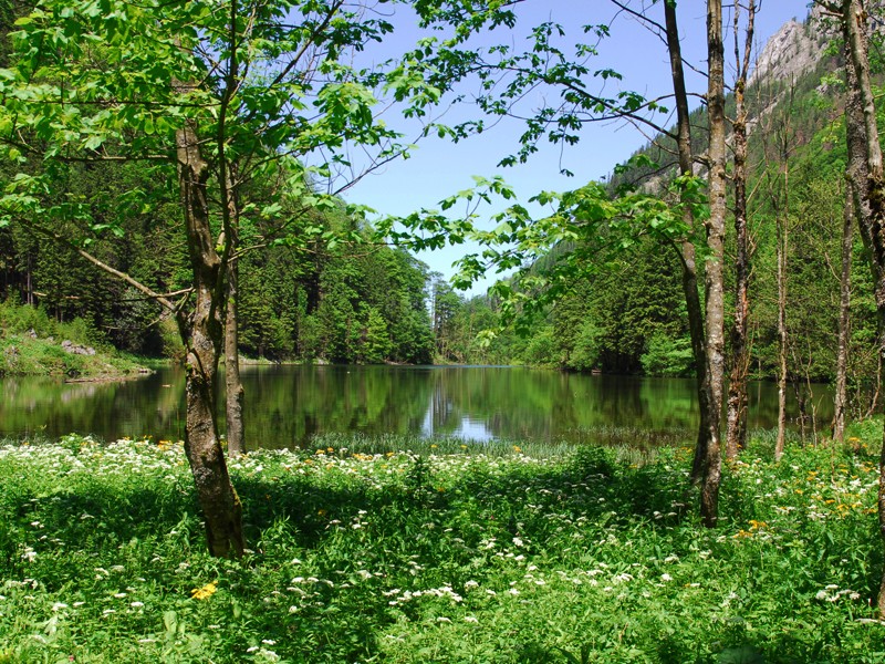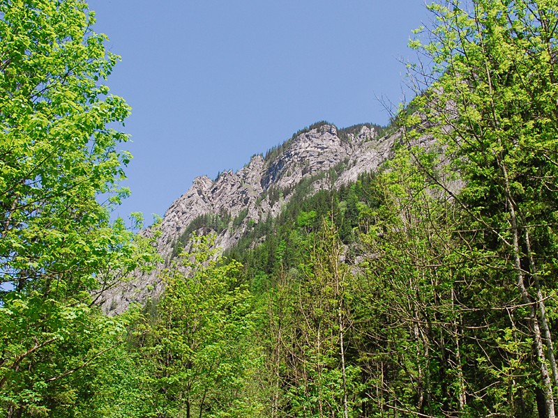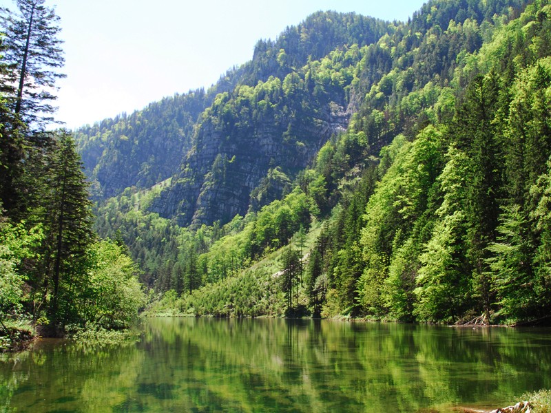 | Der Blick vom Mittersee Richtung Nordost zeigt die Felswände des Scheiblingsteinmassivs: Die Luegmauer aus gebanktem Dachsteinkalk. |
