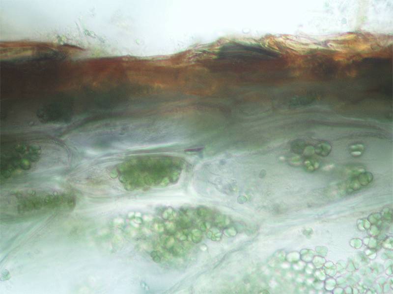 Fruchtschale längs geschnitten: Eine verkorkte Außenhaut, darunter Zellen mit vielen Stärkekörnern.