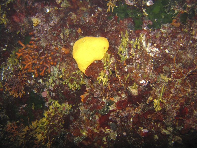 | Links im Bild die Trugkoralle (Myriapora truncata) und rechts vom Schwamm das Elchgeweih-Moostierchen (Schizotheca serratimargo). |