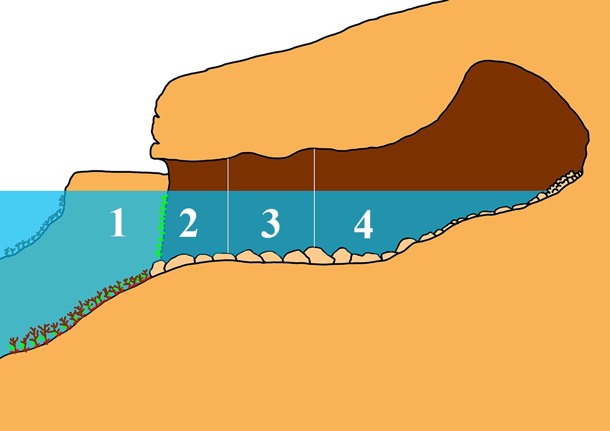 1 Halbschatten und Schatten, 2 Grotteneingang, 3 finsterer Hauptteil, 4 hinterster Teil. In dieser Reihenfolge nimmt einerseits das Licht sehr rasch ab, anderseits auch die Wasserbewegung. Im hintersten Teil befindet sich sogar ein Schotterstrand, darüber ein kuppelartiger Dom. |