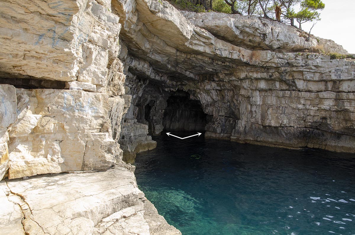 Blick auf den Schattenbereich und den Grotteneingang, wo es nach rechts zu einem Durchgang geht und nach links um eine Kurve in die Tiefe der Grotte. |