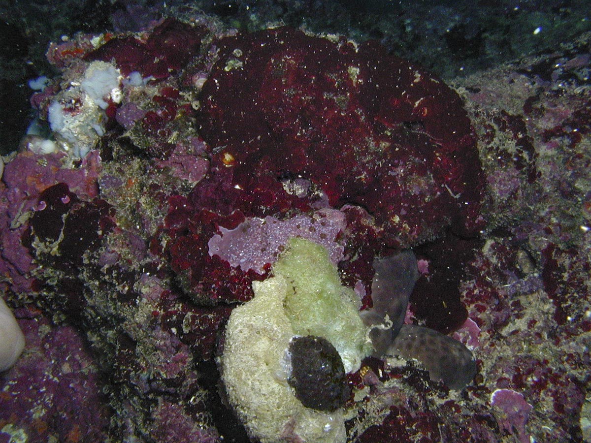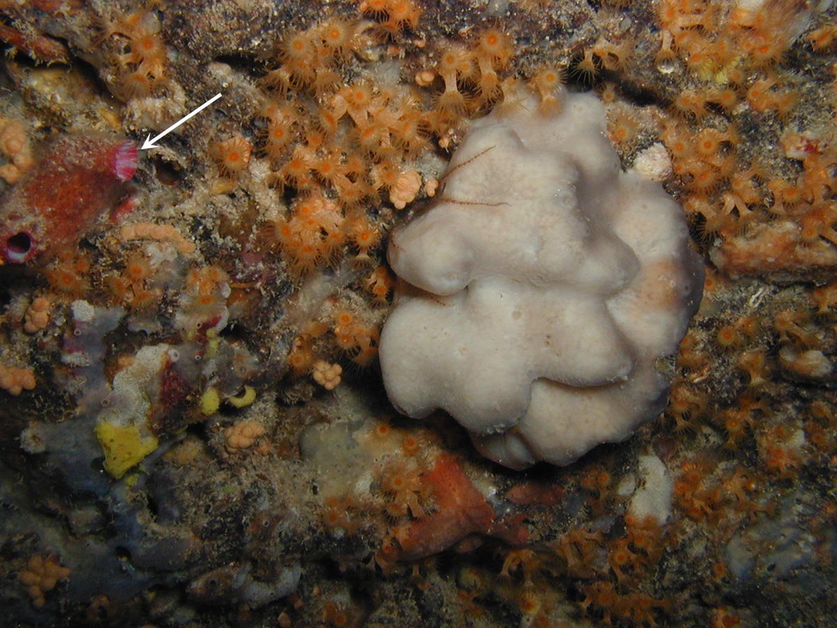 Verschieden gefärbte Schwämme findet man hier. Es ist sinnlos, sie bestimmen zu wollen. Dafür ist die Microcosmus-Seescheide (Pfeil) leichter zu identifizieren. |