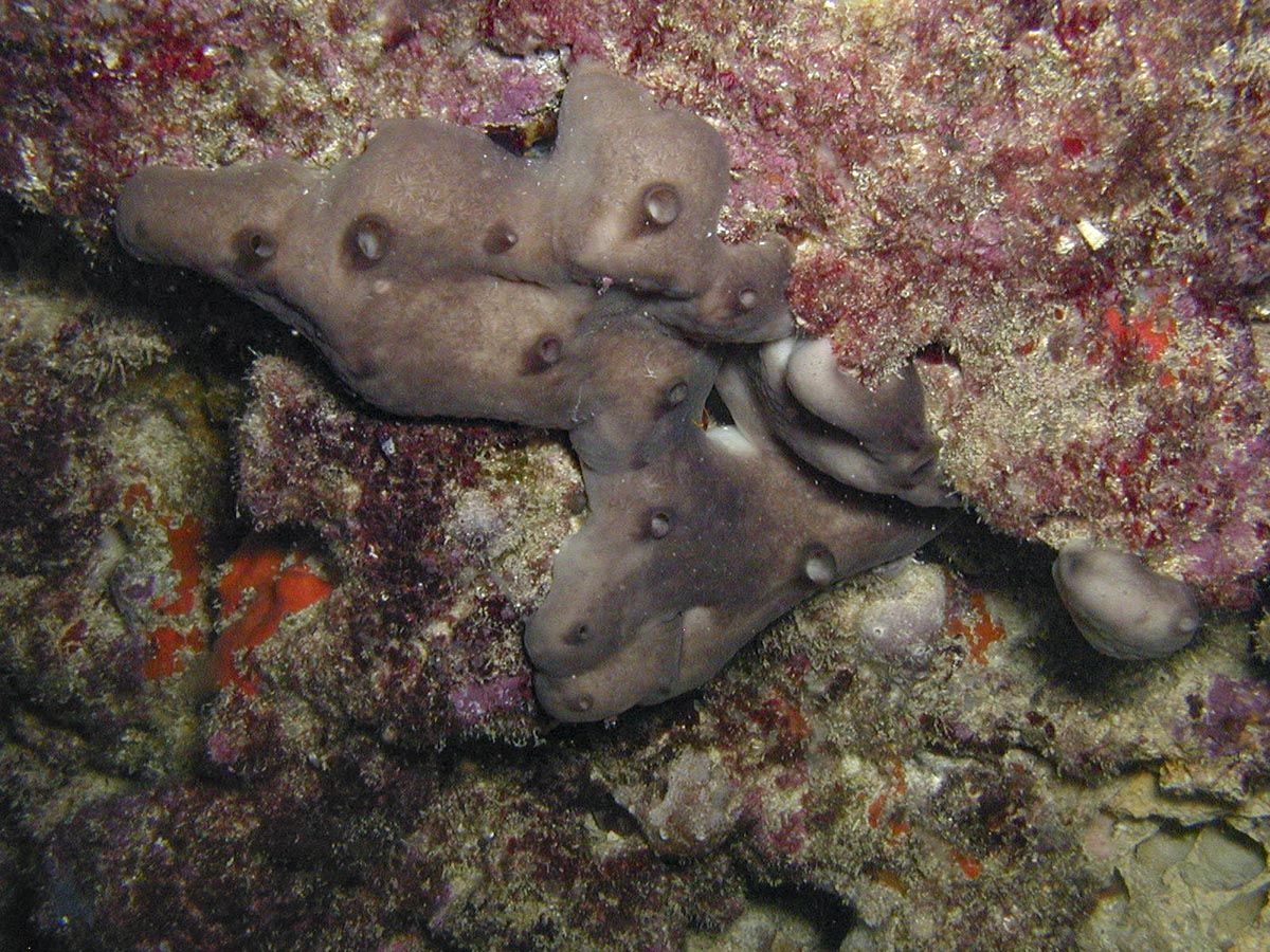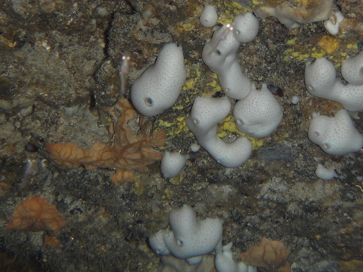 Tiefer in der Grotte ist der Nierenschwamm nun völlig ausgebleicht. Zwischen den Schwämmen unterschiedlicher Färbung erkennt man die dunklen Löcher der Steindattel im Fels. |