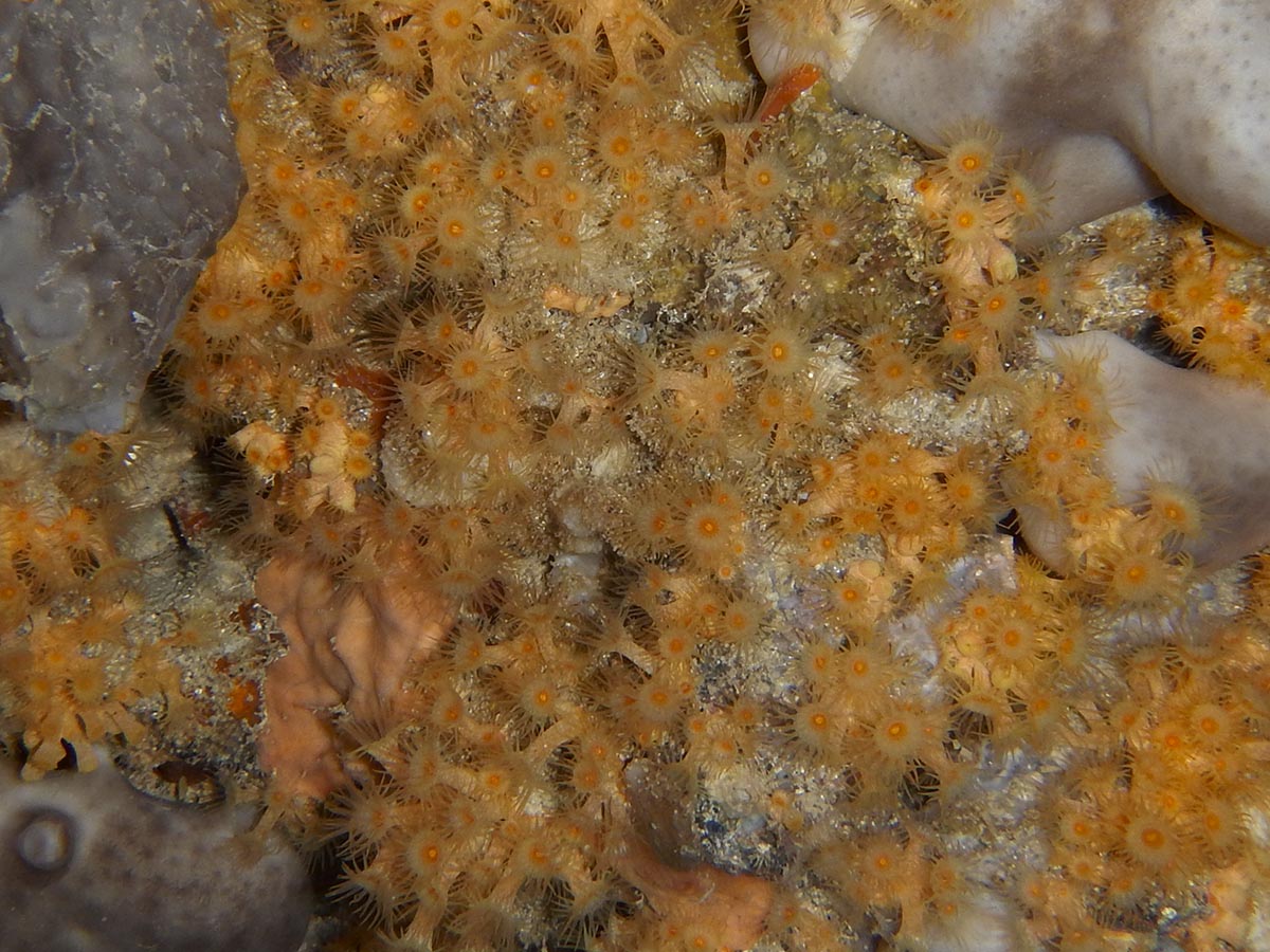 Die Gelbe Krustenanemone kann man bereits am Höhleneingang unter Felsvorsprüngen entdecken. Die Nierenschwämme am Bild beginnen bereits auszubleichen, denn für die symbiontischen Algen ist bereits sehr wenig Licht vorhanden. |