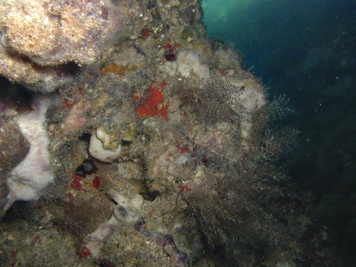 Vermehrt treten nun Hydroidpolypen auf. Es sind nur mehr wenige Krustenrotalgen zu sehen. Offensichtlich reicht das Licht, das vom Höhleneingang bis hieher durchdringt. |